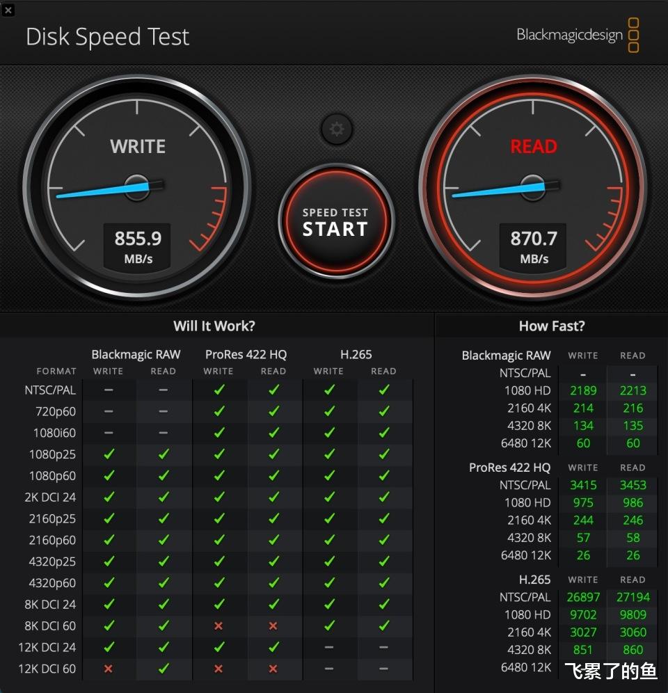 Disk Speed Test测试,实测读取速度约870MB/s,写入速度约850MB/s,而且满足Blackmagic RAW、ProRes 422 HQ以及H.265等标准的8K 60帧甚至8K DCI 24帧的录制需求,因此,用它来实时存储iPhone录制的ProRes 4K 60帧甚至120帧视频是完全OK的。