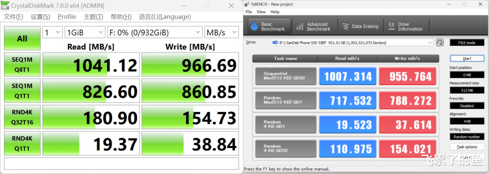 CrystalDiskMark、TxBENCH实测顺序读写速度分别约为1000MB/s和950MB/s之上,符合官方宣传,可能还有点反向虚标,这样的速度无论是备份影像资料,还是实时录制视频都OK,轻松拿捏!