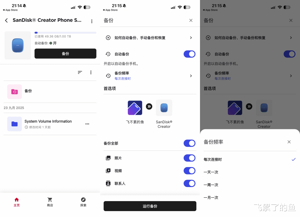 点击硬盘进入功能页面,我们可以选择备份的内容类型(包括照片、视频、联系人)、备份的频率(每次连接时以及每天、每周、每月)。我个人比较建议选择开启自动备份,然后每次连接时备份,这样只要连上硬盘,就能保证硬盘里的数据同步备份成最新最全的,而不用去想着某个时间点去定期备份。