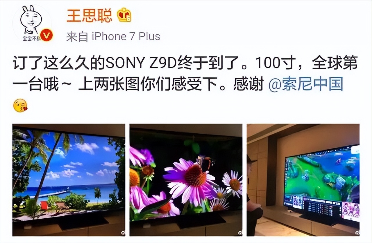 后来2017年王思聪买了100英寸的索尼Z9D,当时也花了50万,装逼装到轰动全国,还上两张图让我们感受下,我感受个P啊,你这样装逼会被扁出国门,贬到日本的,还会牵连你老爹限高的。