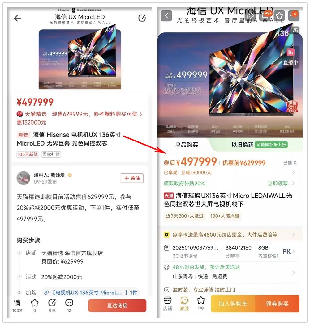 根据张大妈爆料,某猫原价629999元的海信UX136 MicroLED电视,参与20%起减活动,实付低至497999元,一夜暴降132000元。这个“低至”真是用得惟妙惟肖,4万9算根毛啊,老子买了!