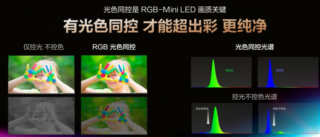 而真正的RGB-Mini LED=RGB三原色背光+光色同控算法。