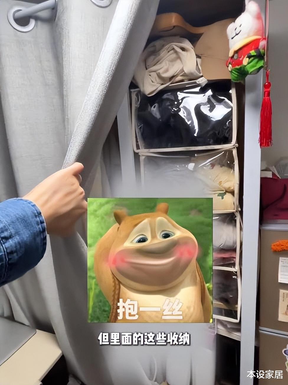 层板柜里塞满了各种衣物和生活用品,为了让空间看起来更加整洁有序,拖把姑娘自己配置了灰色布帘,使劲一拉,眼不见心不烦,哈哈~