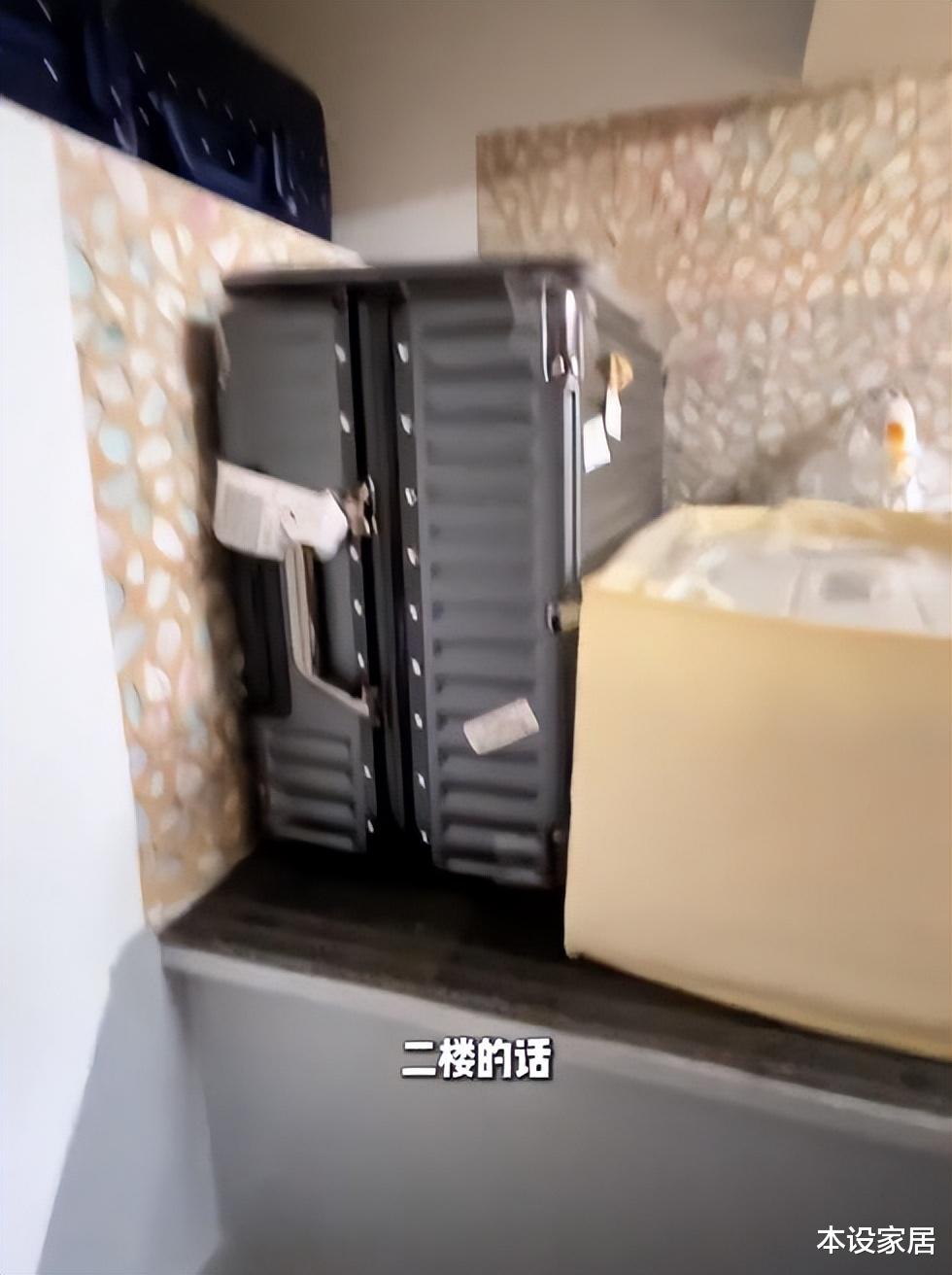 最后是卧室,隐藏在阁楼,从入户门右边的楼梯可以上去,楼梯口的位置放置行李箱,主打一个空间不浪费。