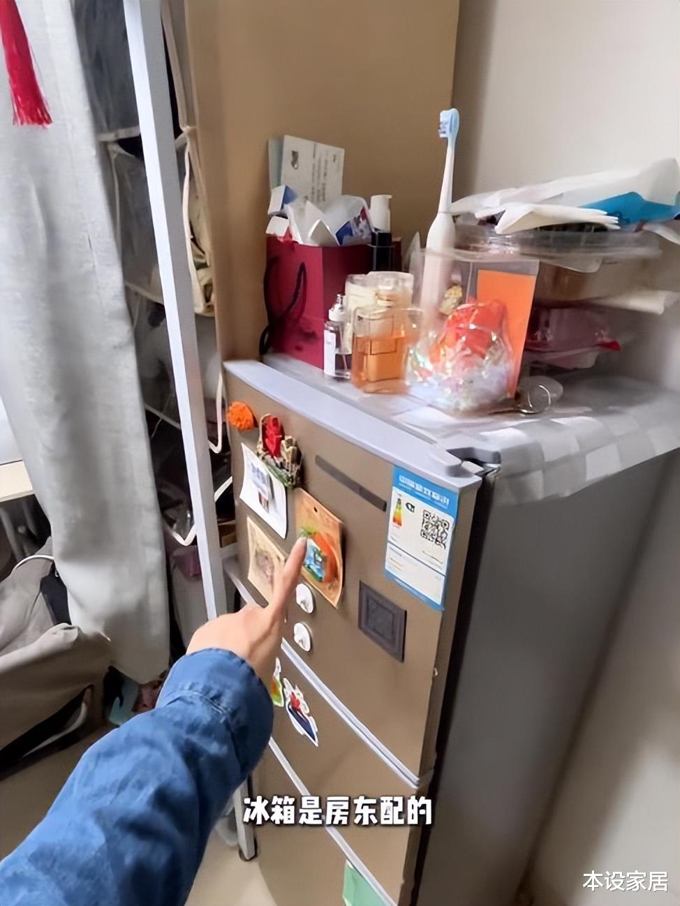 往里是一台小冰箱和层板柜,都是房东配置的,省了不少钱,就算将来搬家也省力。
