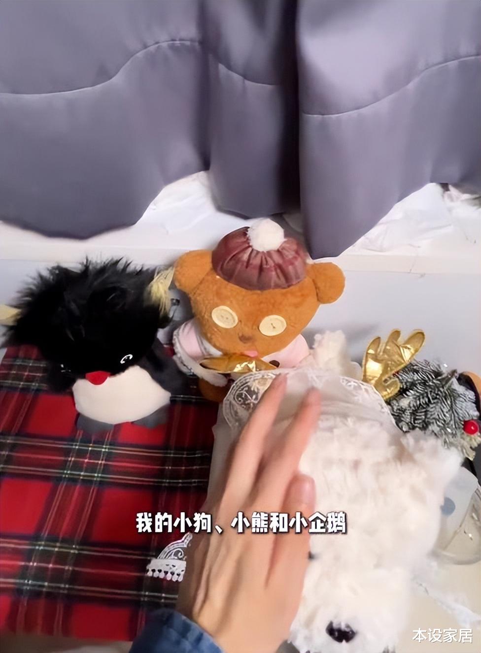 由于面积小不能养宠物,她为自己购买了小狗、小熊和小企鹅等玩具做陪伴,也算是一种精神寄托吧。