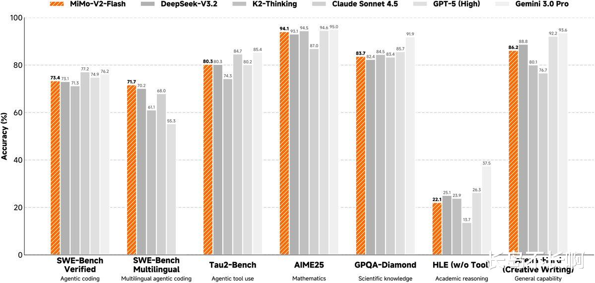 SWE-Bench Verified (代码能力): MiMo (73.4%) > DeepSeek-V3.2 (73.1%) > Claude Sonnet 4.5 (71.3%)。