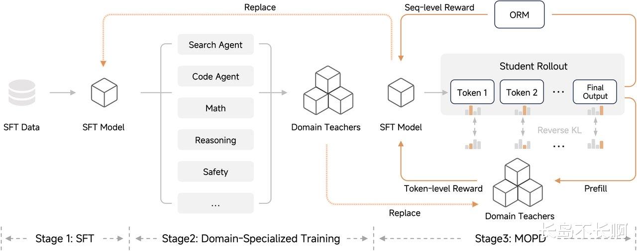 MOPD(多目标偏好蒸馏): 最后还要经过一轮像“炼丹”一样的奖励模型(ORM)筛选。