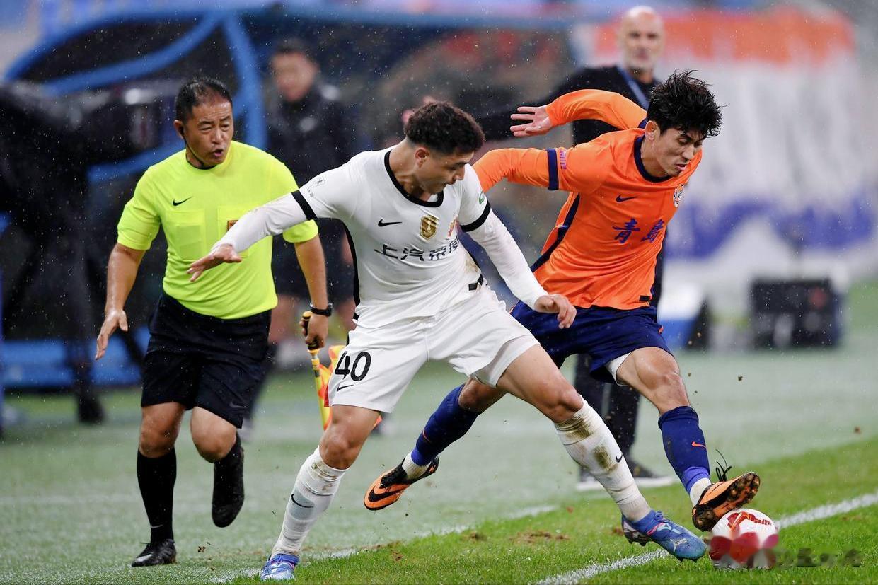 本来两边还差不多,结果西海岸自己出问题了。第34分钟,孙捷在后场防守,侧身蹬踹于汉超膝盖,动作挺危险,主裁一开始给黄牌,VAR 回看后改成红牌,孙捷下去了,西海岸10打11。还没完,上半场补时,张呈栋因为不满边裁举旗判越位,觉得举早了打断进攻,当场就跟裁判吵,裁判给了张黄牌,没一会儿又给一张,两黄变一红,也下去了。西海岸场上只剩9个人,这球怎么踢?