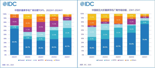 在智能手机市场日趋饱和的大背景下,折叠屏成为最具增长潜力的细分赛道,而华为则是这一领域绝对的统治者。据IDC相关数据,2025年上半年华为以高达 75% 的市场份额再度蝉联国内折叠屏市场第一,同时也成为中国首个累计出货量突破1000万台的厂商。对比去年同期42.7%的份额,华为仅用一年时间便实现巨幅提升。