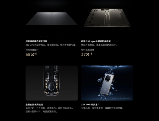 除大屏体验之外,折叠屏另一个体验核心是可靠性。华为Mate X6搭载的玄武水滴铰链核心部件100%使用1900MPa超强火箭钢,强度提升27%;屏幕保护也迎来重大升级,其典藏版外屏搭载第二代玄武钢化昆仑玻璃,抗刮耐磨耐摔能力全面升级;内屏则采用创新碳纤维支撑层,有效抵抗变形;中框采用超强机翼铝,强度提升37%。得益于一系列创新技术,使得华为Mate X6不仅更加轻薄便携,日常使用中还可以提供更加安心可靠的体验。