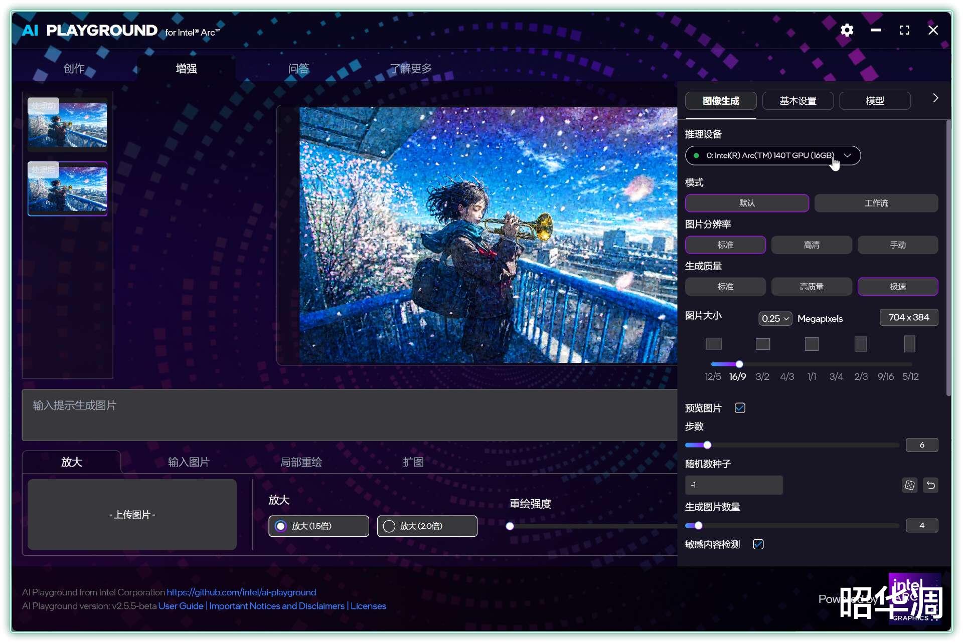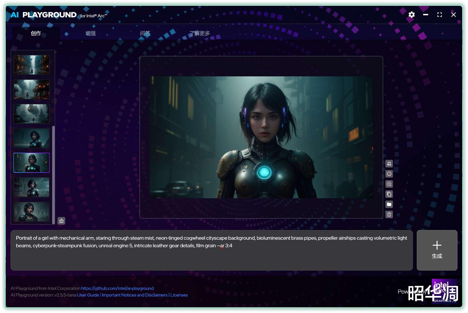 输入提示词就能快速生成图片,像这套四张的蒸汽女孩在急速模式下,仅需 16s 即可完成,Ultra 9 285H 的核显的确挺强的。