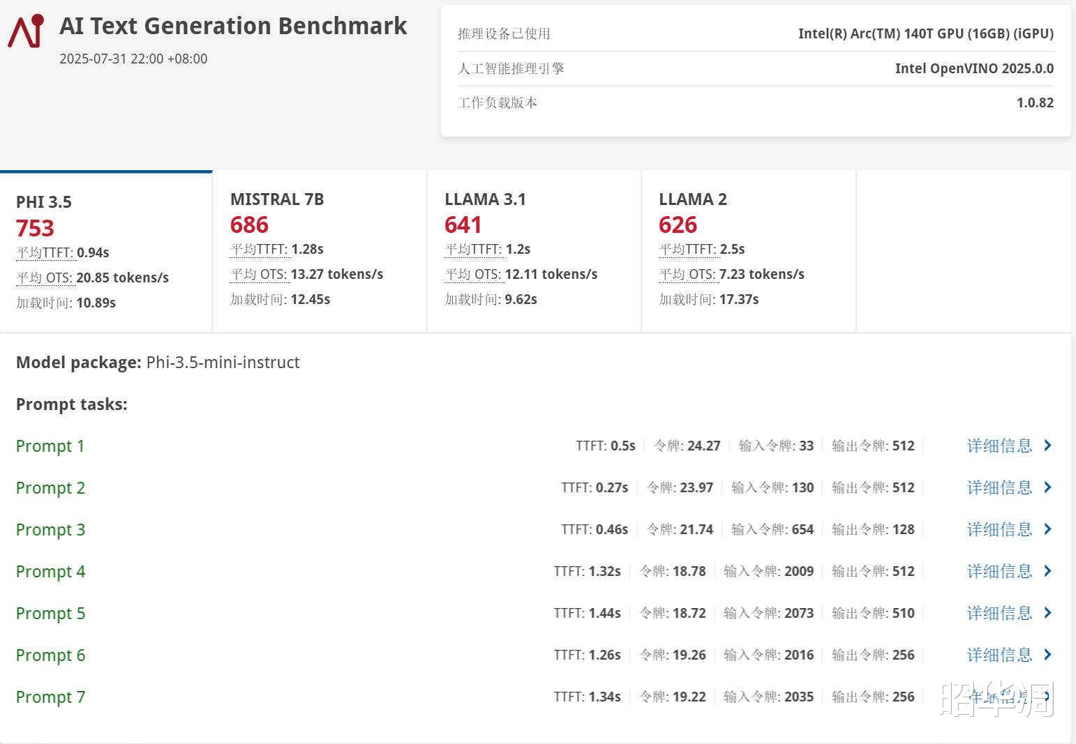▼UL Procyon AI 文本生成基准测试:此项测试专注于本地大型语言模型(LLM)的推理能力,模拟设备端 AI 助手应用。零刻GTi15 Ultra在各项模型测试中的得分如下:PHI 3.5:753 分 、 平均 TTFT 0.94s 、 平均 OTS 20.85 tokens/s 、 加载时间 10.89s
