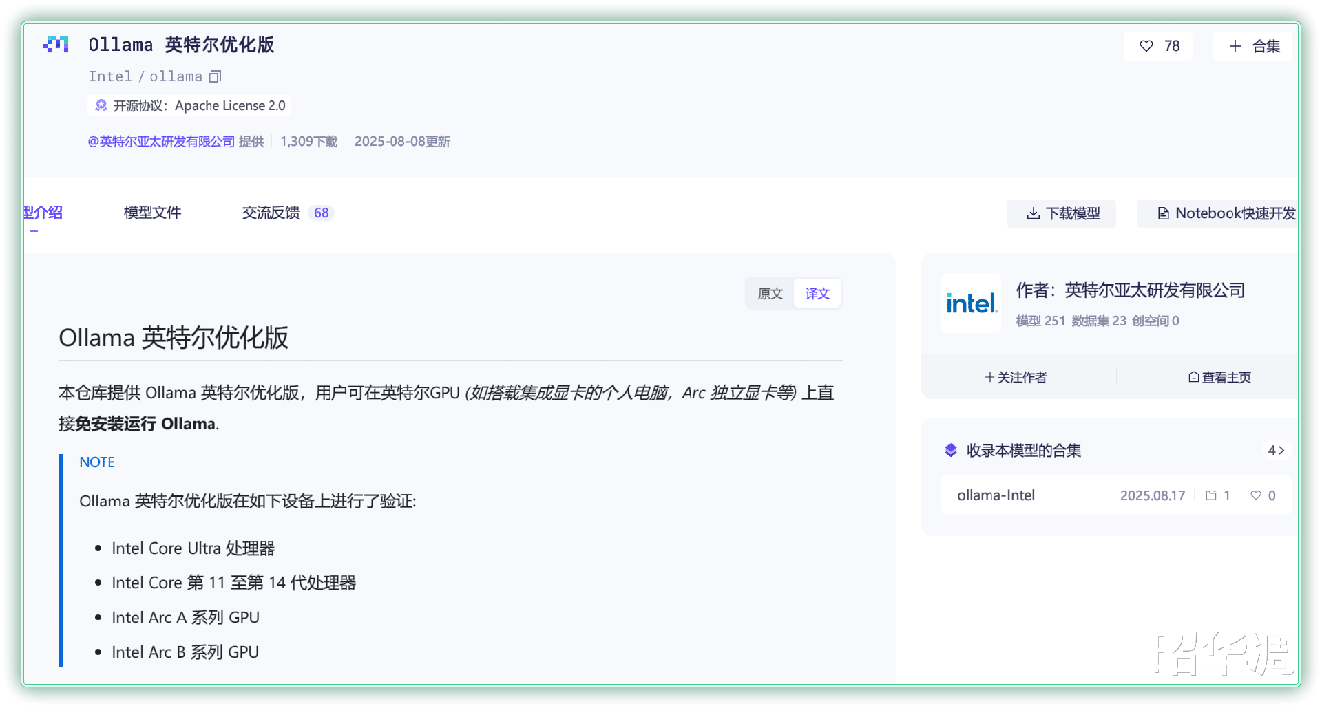 ▼之前笔者分享过利用Ollama 进行本地部署的例子,但可能很多朋友不知道,Intel 也针对 Ollama 推出了款定制优化版,能够更好的调用285H 强悍的 GPU 性能,相关软件和教程已在ModelScope 魔搭社区正式上线,感兴趣的朋友可以自行下载。