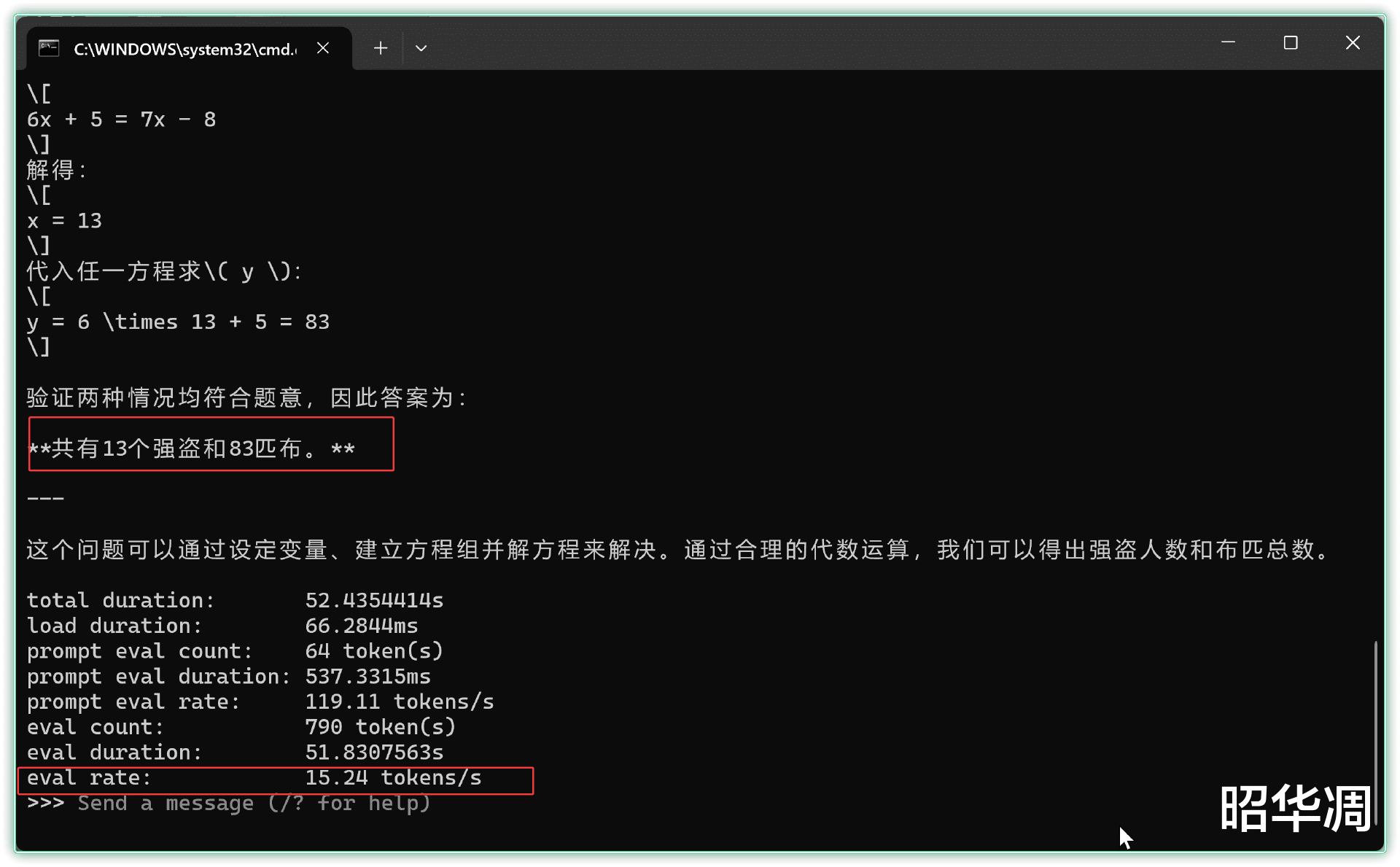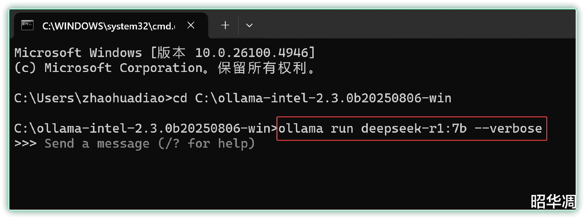 ▼拉取完成后,新建 CMD 窗口,并输入下面的命令和模型进行问答,后面添加的verbose 后缀能显示当前问答的耗时、速率等相关参数,方便进行性能对比。