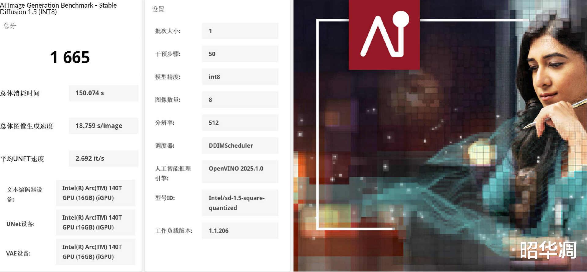 ▼AI Image Generation Benchmark(文生图),这个测试通过创建 8 幅分辨率为512 X 512的图像,汇总效率并打分。零刻GTi15 Ultra 在本次测试得到了 1665分,总体消耗时间150074s,图像生成速度为18.579s/image,平均 UNET 速度 2.692it/s,。