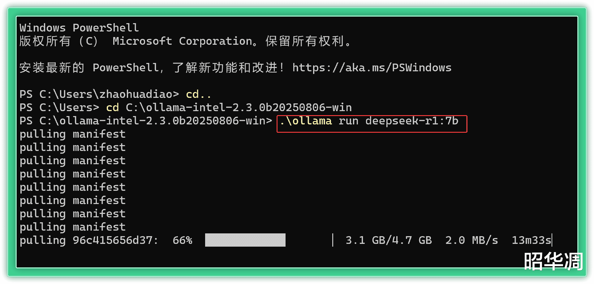 ▼再次输入以下命令进行模型拉取,这里选择的 7B 模型,毕竟285H 的核显能够将部分内存划分为显存使用,显存基本不会成为瓶颈。
