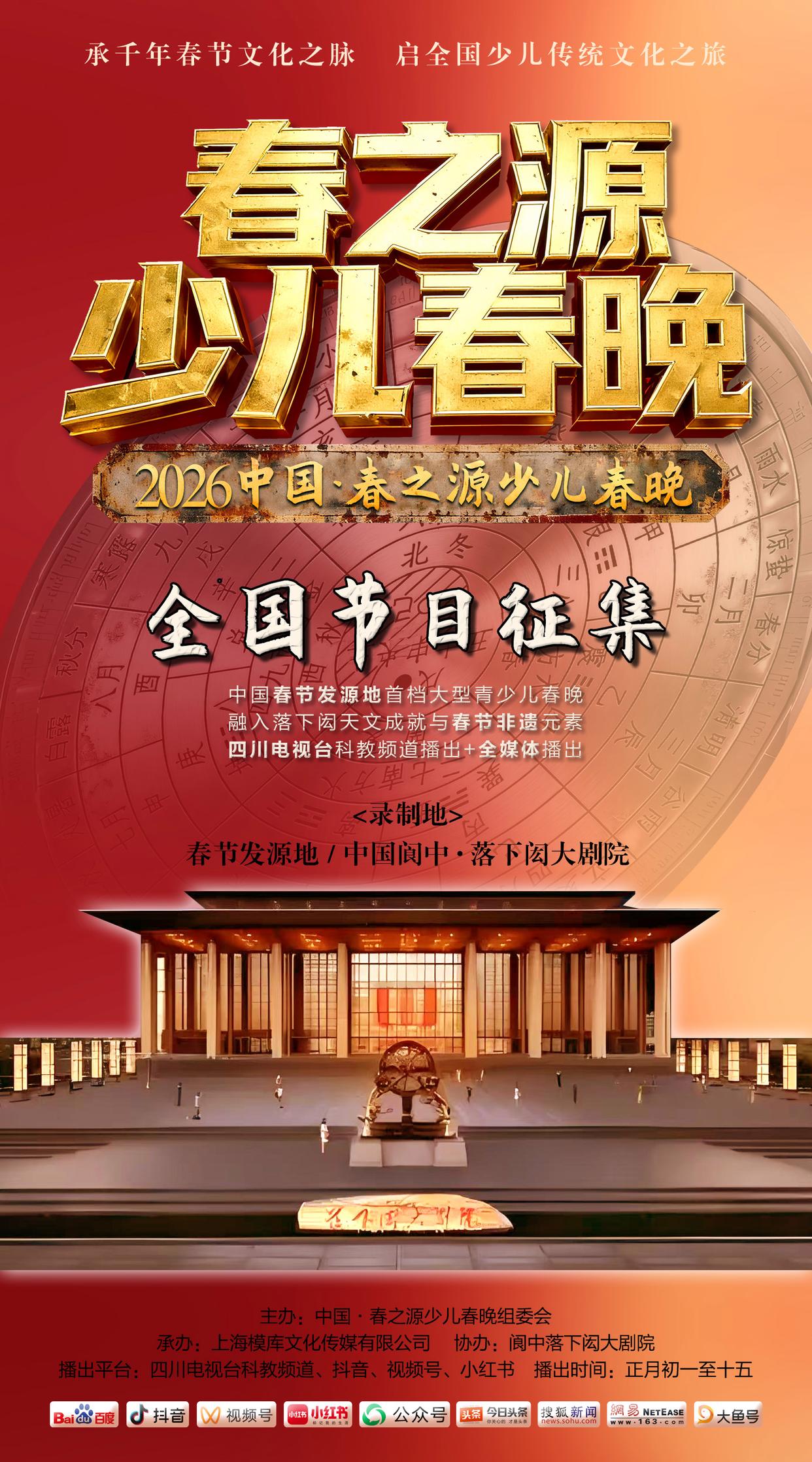 中国“春之源”少儿春晚由上海模库文化传媒有限公司承办,并在中国春节发源地——四川阆中“落下闳大剧院”录制,“承千年春节文化之脉,启全国少儿传统文化之旅”,组委会致力于为中国少年儿童打造一个传承传统文化、展示才华才艺的国家级舞台。本届春晚将于2026年春节期间,在四川电视台科教频道播出,同时在抖音、视频号、小红书等平台同步推送,覆盖正月初一至十五,陪伴全国观众共度马年新春。