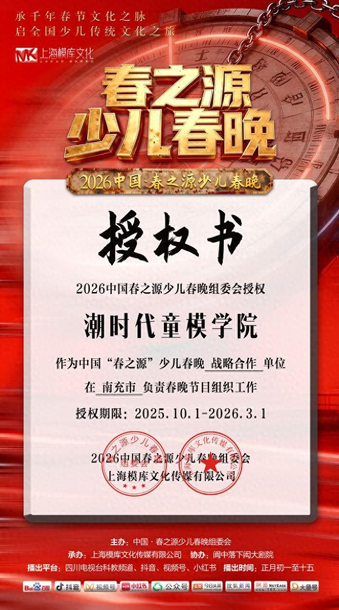10月15日,2026中国“春之源”少儿春晚组委会正式授权潮时代童模学院作为南充区域“战略合作单位”,负责南充地区春晚节目组织工作。此举标志着一年一度的少儿传统文化盛宴——中国“春之源”少儿春晚正式拉开帷幕,也体现了社会力量在推动少儿美育与传统文化传承中的积极参与性。
