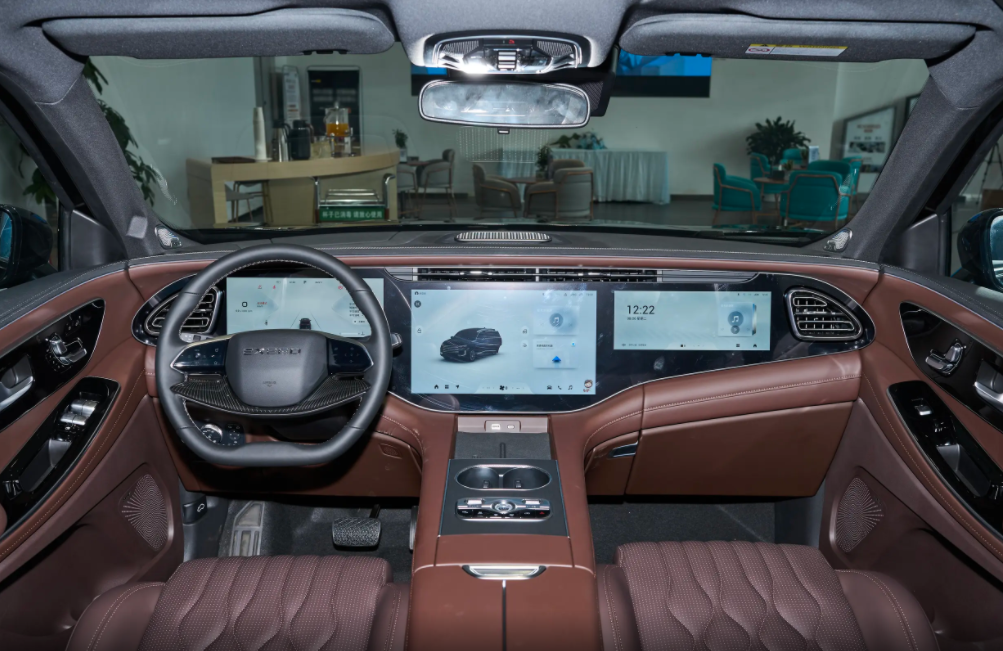 打开车门来到车内,全新星途揽月的座舱设计还是蛮有科技氛围感,其与老款车型一样,均为平面三屏幕的中控布局,而且空调出风口也是隐藏式的设计语言,而相比老款车型,全新星途揽月优化了客户反馈的问题,针对多功能区域的按键进行了前移设计,并同步取消了中央扶手箱后部储物槽盖板,转而采用了开放式的设计语言,同时在座椅布局方面,六座布局也成为了全系可选的设计。