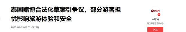环球网——泰国赌博合法化草案引争议,部分游客担忧影响旅游体验和安全——2025-01-15