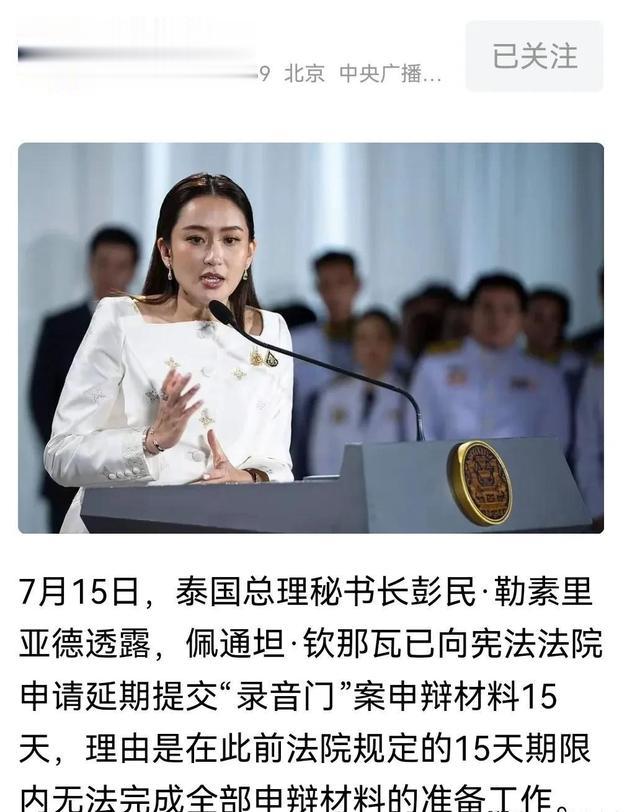 7月15日,泰国总理秘书长彭民·勒素里亚德透露,佩通坦·钦那瓦已向宪法法院申请延期提交"录音门"案申辩材料15天,理由是无法在原定期限内完成全部申辩准备工作。