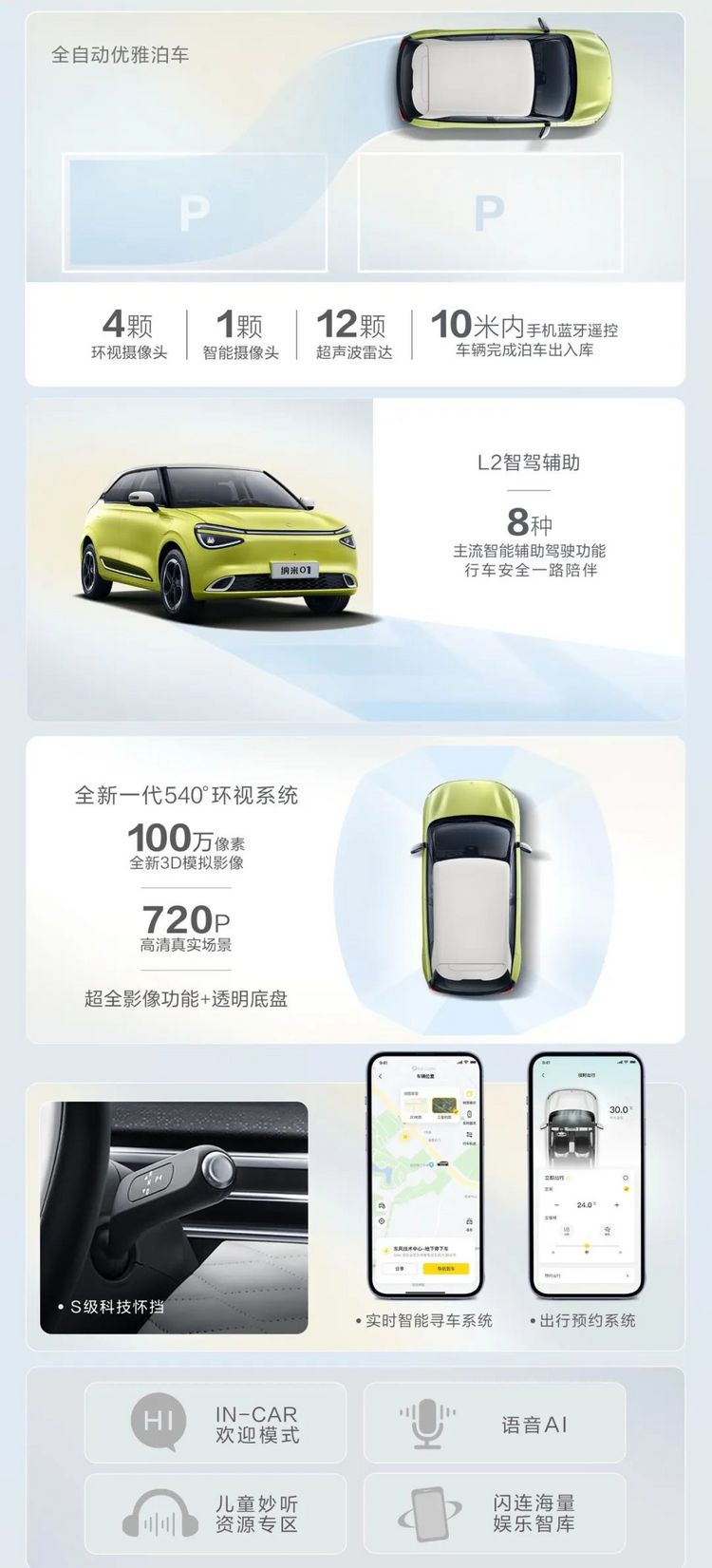 L2驾驶辅助+遥控泊车,科技拉满L2智驾辅助出现在纳米01上没有任何的意外,自适应巡航、智能领航辅助、前方碰撞预警、自动紧急制动、车道偏离警告、车道保持辅助、道路交通标识识别等等驾驶辅助功能它全都具备,很大程度上能够帮助驾驶者减轻疲劳,提升主动安全性。
