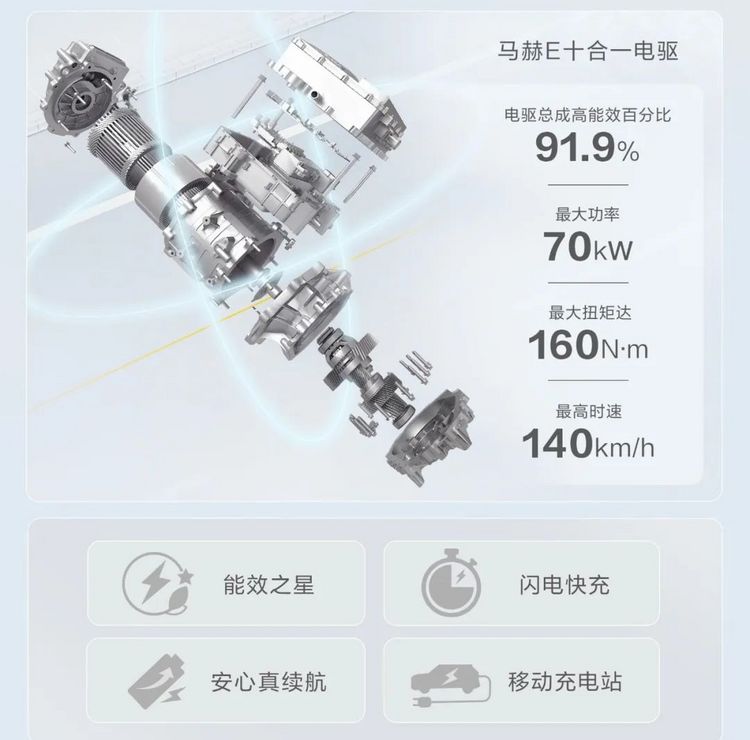 快充+对外放电,满足一切对电动车的需求纳米01搭载了马赫E十合一电驱,电驱总成能效91.9%,CLTC综合工况效率89%。电机的最大功率为70千瓦,相当于95马力,峰值扭矩是160牛·米,最高车速可以达到140公里/小时。共有330公里和430公里两种续航的版本可选,相比海豚、缤果、海鸥的标称续航还是有着一些优势的。