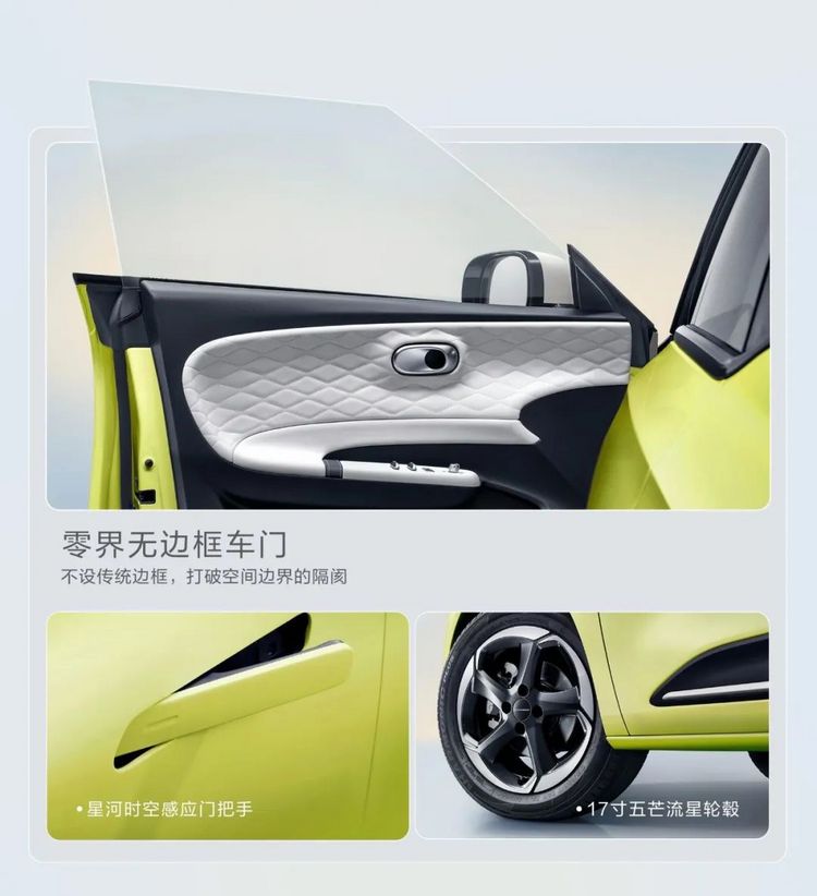 纳米01的车门采用了同级唯一的无框车门,打破了空间边界的同时也更加时尚美观。凭什么只有轿跑车和跑车能用无框车门,国民车同样可以享受无框车门的精致和浪漫。再配合上感应启动的隐藏式门把手,扑面而来的仪式感和浪漫,即便是遇到生活中的种种烦恼,一瞬间也都能灰飞烟灭。撞色车顶和17英寸轮圈,轻盈流动散发出的光彩,也给生活增添了一份松弛。