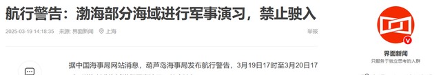 信息来源:界面新闻2025-3-19航行警告:渤海部分海域进行军事演习,禁止驶入
