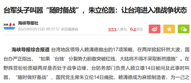 信息来源:海峡导报社2025-3-15台军头子叫嚣“随时备战”,朱立伦轰:让台湾进入准战争状态