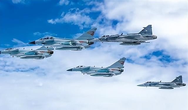 多架次军机在蓝天中呼啸而过,其矫健的身姿仿佛是天空的守护者,对台岛形成了高空的压迫态势。