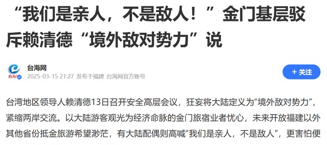 信息来源:台海网2025-3-15“我们是亲人,不是敌人!”金门基层驳斥赖清德“境外敌对势力”说