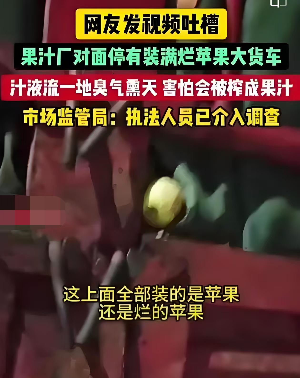 近日,陕西咸阳的一个果汁厂被爆料出,他们竟然用烂到不能再烂的苹果榨果汁。这事儿被一个叫王先生的哥们儿发现了,他用手机拍下了这一幕,然后勇敢地把视频发到了网上。这哥们儿,我得说,勇气可嘉!