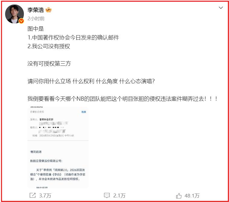 在控诉中,李荣浩不仅晒出音著协未授权证明、拒绝授权的邮件截图。