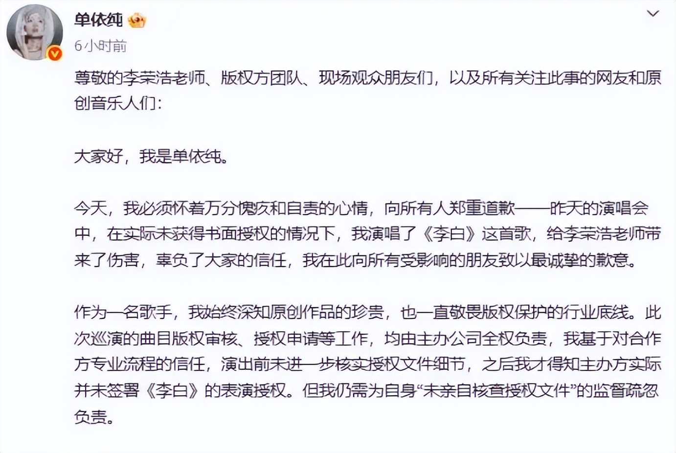 也就是说,在明知未获授权的情况下,单依纯团队仍执意演唱该曲目。