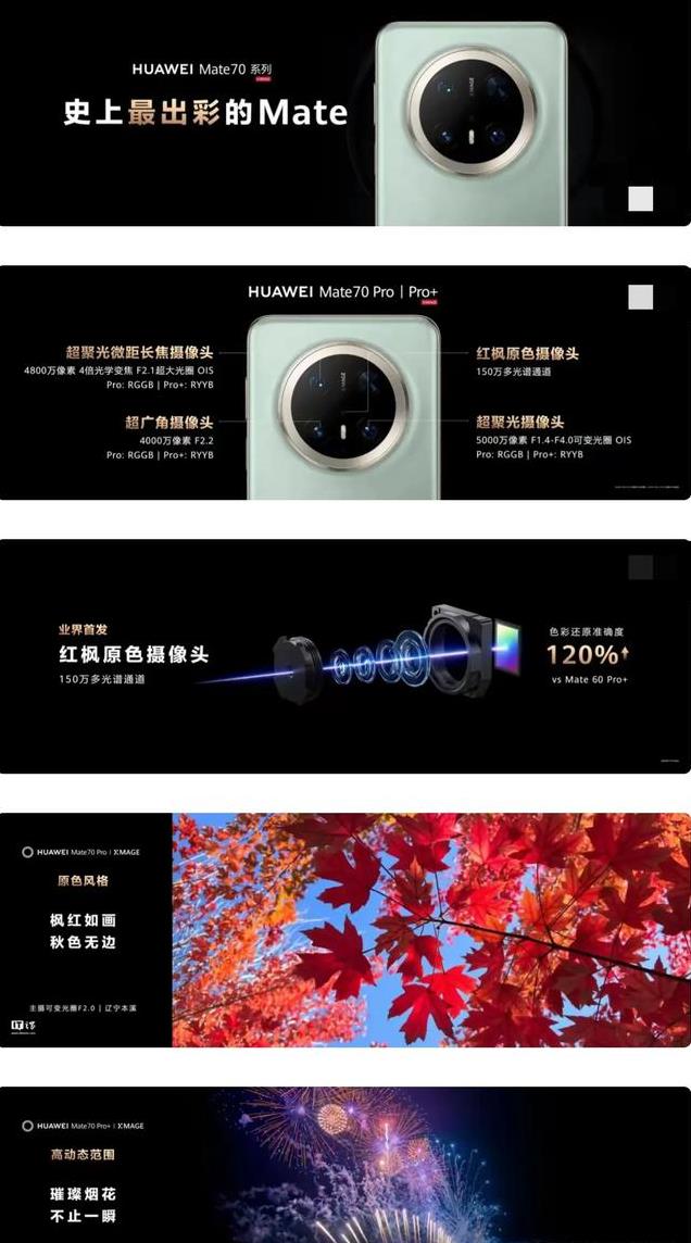 而今年的Mate70系列,新加了一颗150万多光谱红枫原色摄像头,提高色彩还原度,让照片更加逼真,其他手机厂家还在堆像素,而华为却研究起色彩还原,让拍出的照片和人眼所看见更接近,提高用户体验。