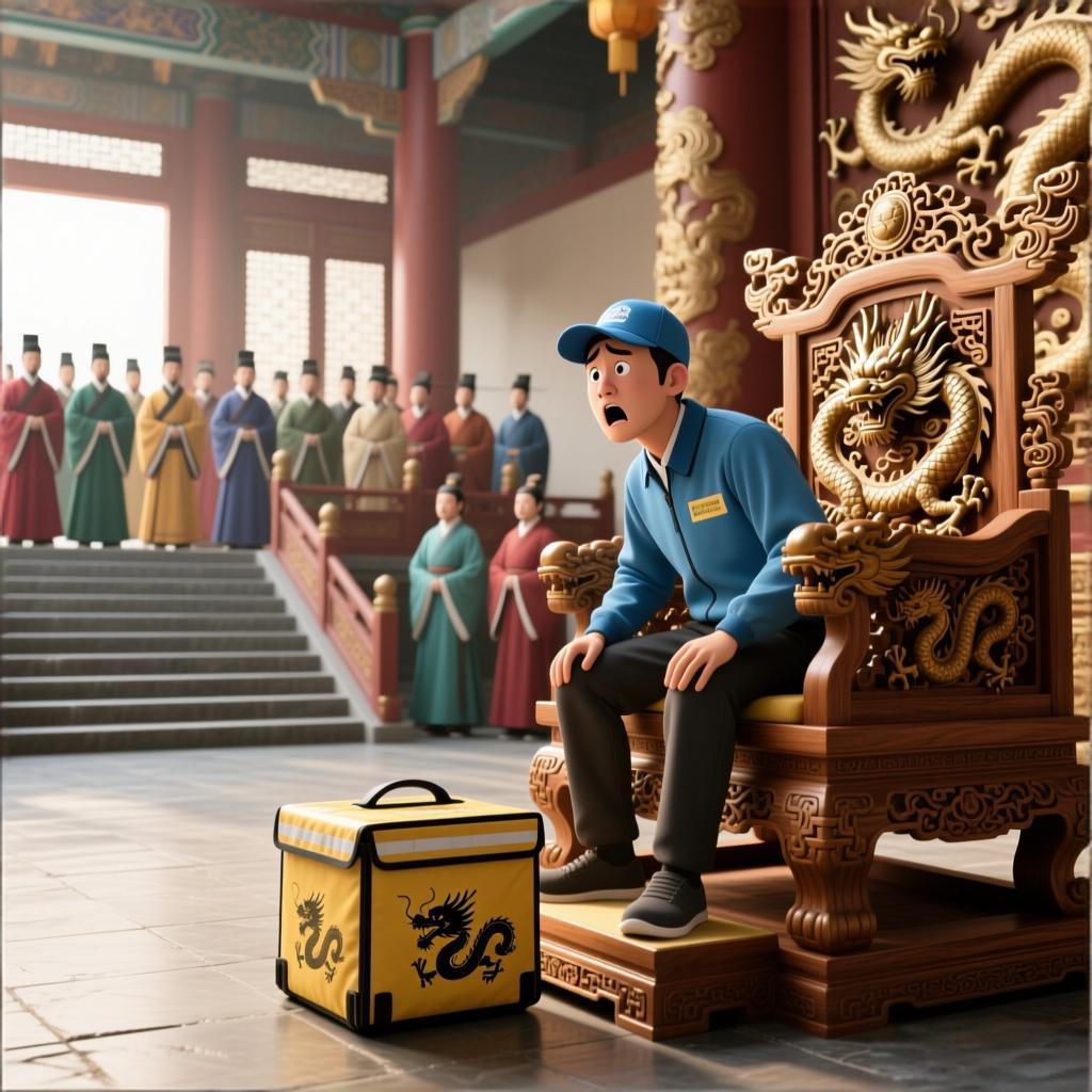 他冲我咧嘴:“兄弟,辛苦,朕替你跑单,你替朕坐江山,目标只有一个——明晚子时前,把最后一单送到,否则皇位换人,脑袋也换。”