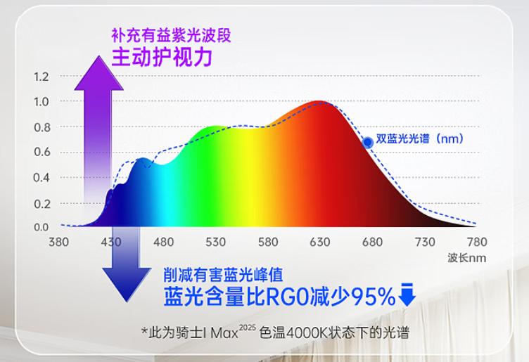 骑士IPro用了韩国首尔灯珠,搭配紫光全光谱技术,实现单一紫光激发,纯净安全,主动护视力。色温4000K时光谱有害蓝光含量减少95%。
