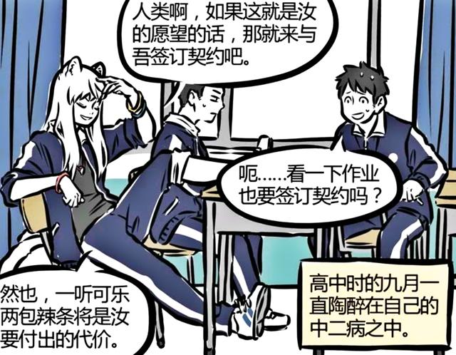 很难想象这是九月待的高中生活,大部分的学生都在为学习而忙碌,怎么可能有这么多的闲情逸致去做这种无聊的事情?但她还是很现实的,一罐可乐,两盒辣条,动漫里的合同可不是那么容易签订的。