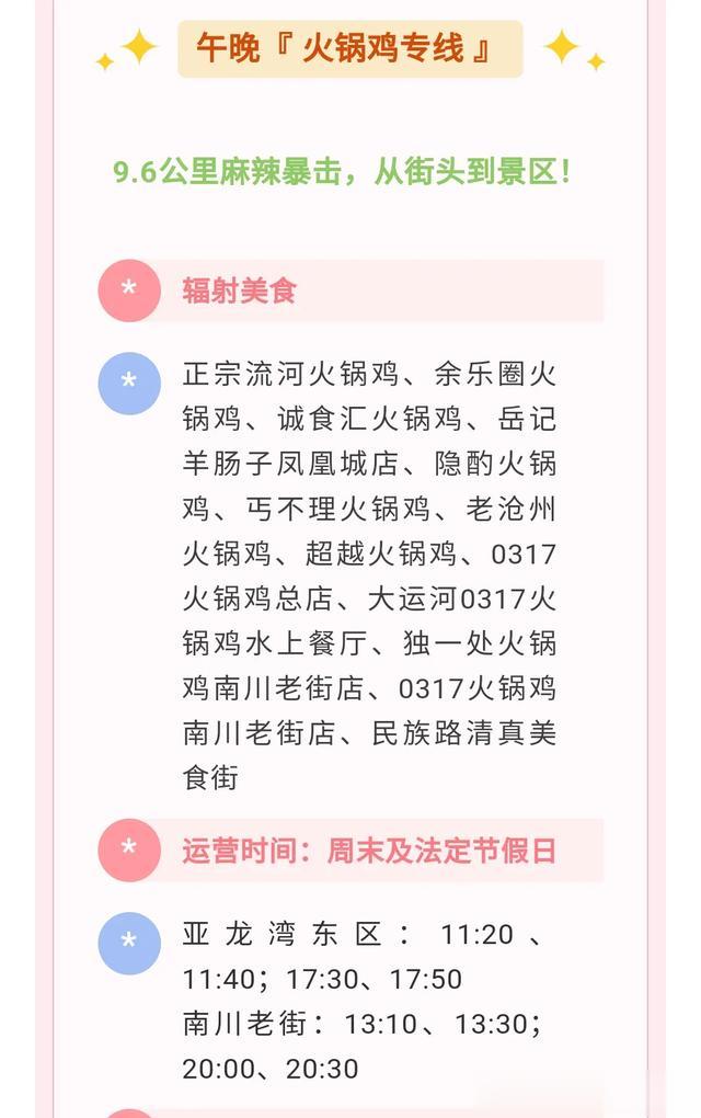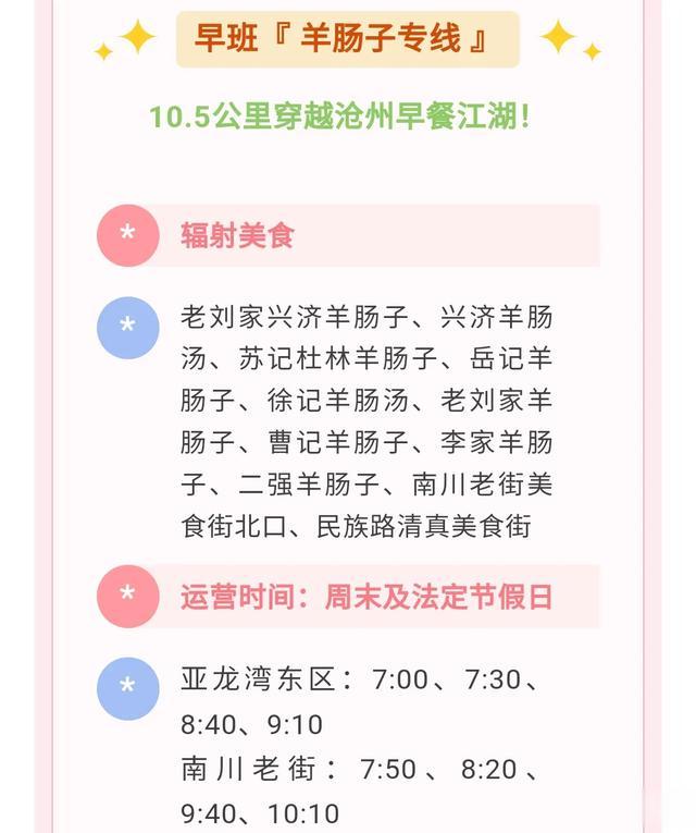沧州公交又又又发力了,竟然又开通了旅游美食专线,而且是根据早晚餐分别量身定做的,你不得不佩服沧州公交的想象力和执行力,在这个周末,也就是4月19日已经开始运行了,以后逢周末节假日专线运行。