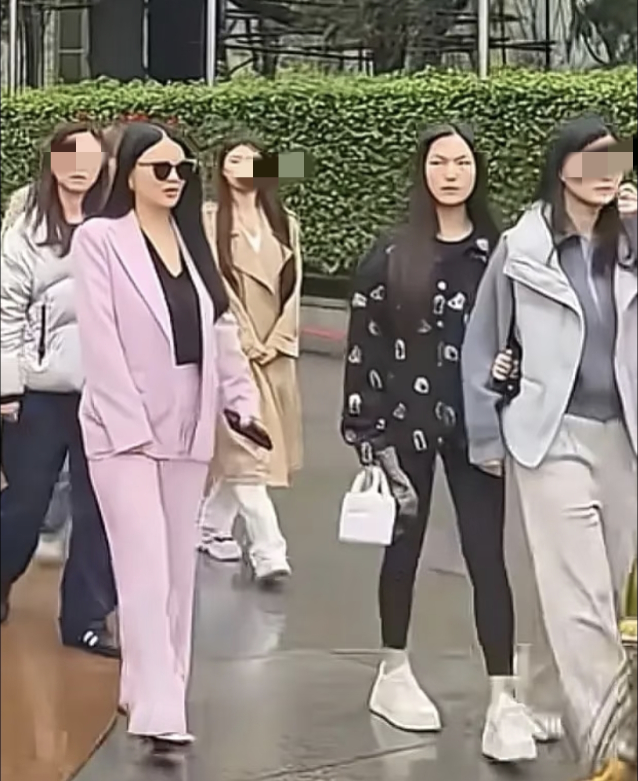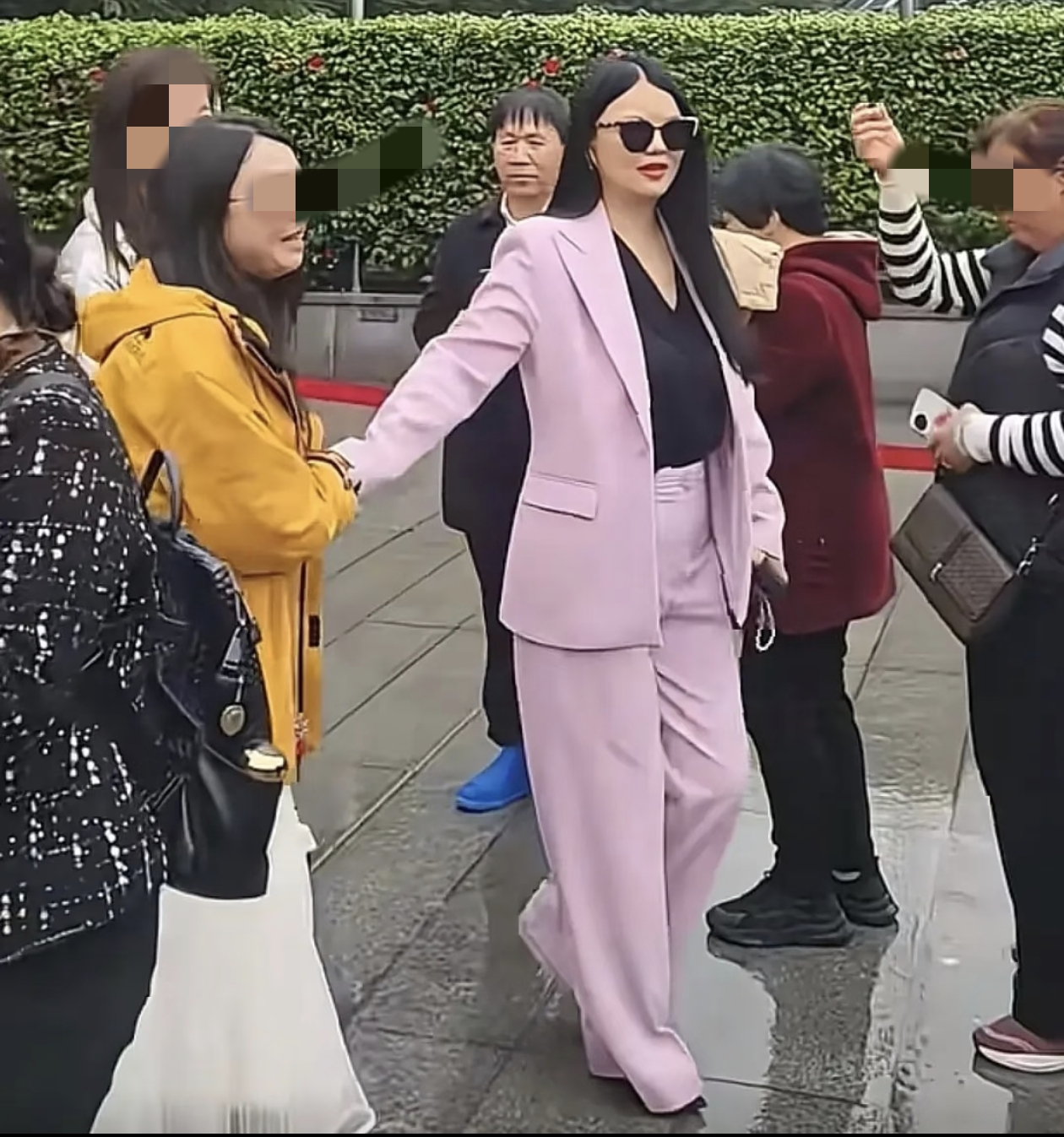 李湘穿着粉色西装,戴着墨镜,小腹平坦,腰线很明显,肉眼可见瘦了很多。被问到是不是因为压力太大才瘦这么多,李湘还点头默认了。