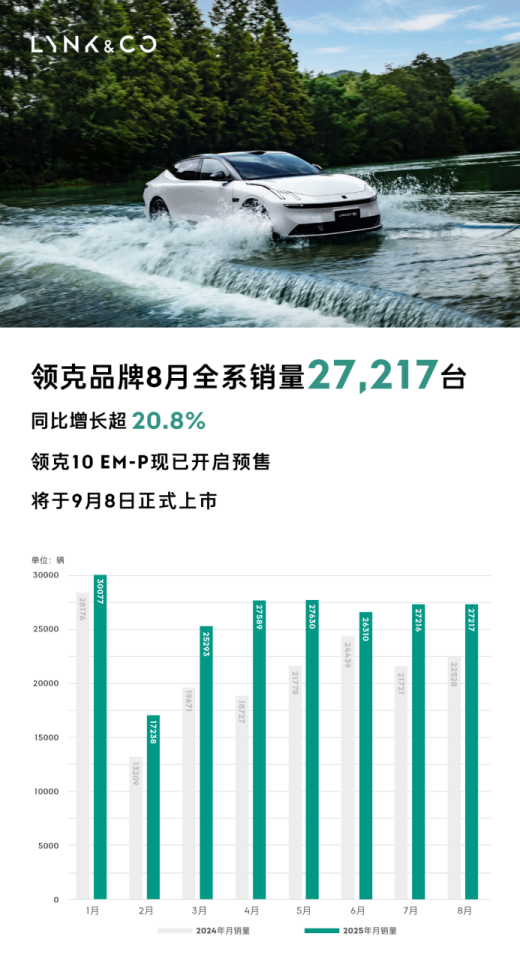 2025年8月领克销量为27,217台