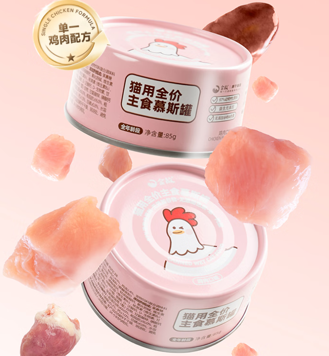 高性价比主食罐头红黑榜测评:金故是在2024年崛起的本土新锐品牌,主营宠物主粮和零食,其营销集中在抖音平台,通过与宠物垂类达人合作和直播带货提高了关注度。这款全价主食慕斯罐只有鸡肉味一种选择,主要原料是鲜鸡小胸,还有鲜鸡肝、鲜鸡心和鸡油。需要注意的是,里面含有宠物饲料复合调味料,官方介绍是鸡肝水解物、防腐剂和抗氧化剂。该罐头还用海藻粉来帮助猫罐头成型。85 g装,罐身设计比较简约,以粉色为主色调,印有卡通小鸡形象。