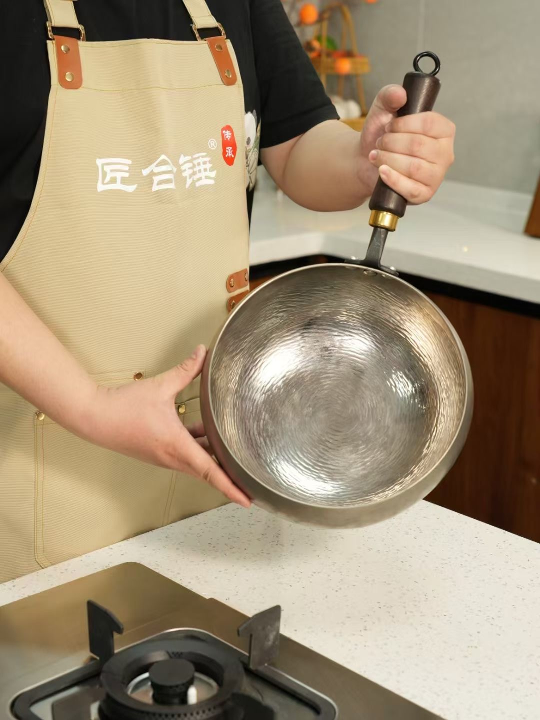 从工艺上来说,这口锅真正经过人工锻打,板材紧实密实。老师傅们凭借着精湛的手艺,对钛板进行上万次的捶打,使得锅体的密度更高,结构更加均匀。这种传统的手工锻打工艺,不仅传承了匠心精神,还赋予了锅具独特的性能。与普通的机器制造锅具相比,手工锻打出来的匠合锤钛锅在物理不粘性能上表现更为出色。