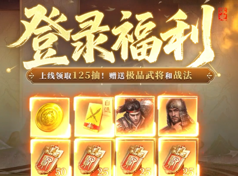 开服前七天,免费送125抽卡券、2480黄金及多个橙将和战法。这么多的抽卡券,让大家有机会抽到更多强力橙将。黄金也能在游戏里发挥重要作用。很多新手靠着这些福利,迅速提升了自己的实力。