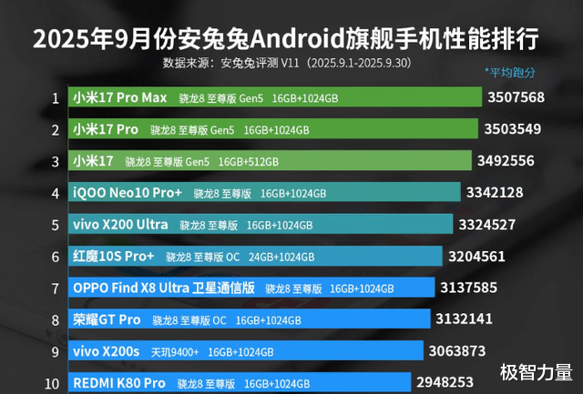 稳定数月的安卓手机性能榜,终于随着高通、联发科新的旗舰芯片的发布,改变了布局。根据安兔兔最新一个月的性能跑分数据,新榜单的位次发生大幅变化。首发第五代骁龙8至尊版的小米17系列包揽前三。中杯、大杯、超大杯的平均跑分均达到了350万左右。相比之前一代骁龙平台的机器,跑分提升大约15万起。