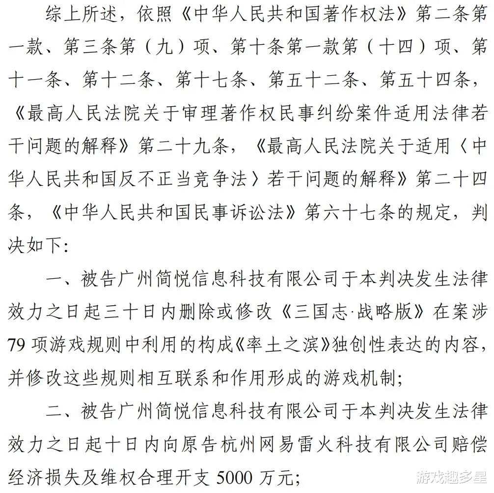 法院认为,《三国志·战略版》在结构上使用了《率土之滨》多达79项独创规则,构成著作权侵权,判令其运营方简悦公司修改内容,并赔偿网易5000万元。