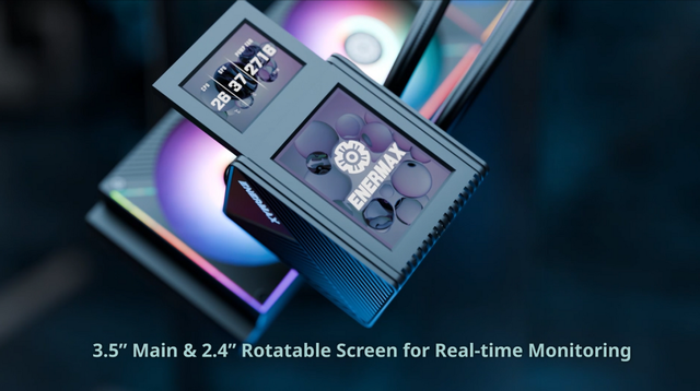 散热器配备双荧幕显示,主荧幕为3.5”全彩TFT LCD,并搭载可旋转90度的2.4”副荧幕,提供灵活的视觉界面显示。