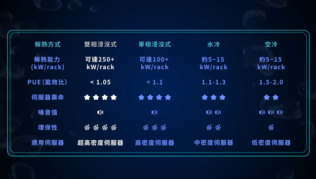 其冷却系统透过冷却液的相变热交换来循环散热,冷却液的热吸收能力为空气的100倍,与传统气冷式散热相比,碳排放可减少近两倍。